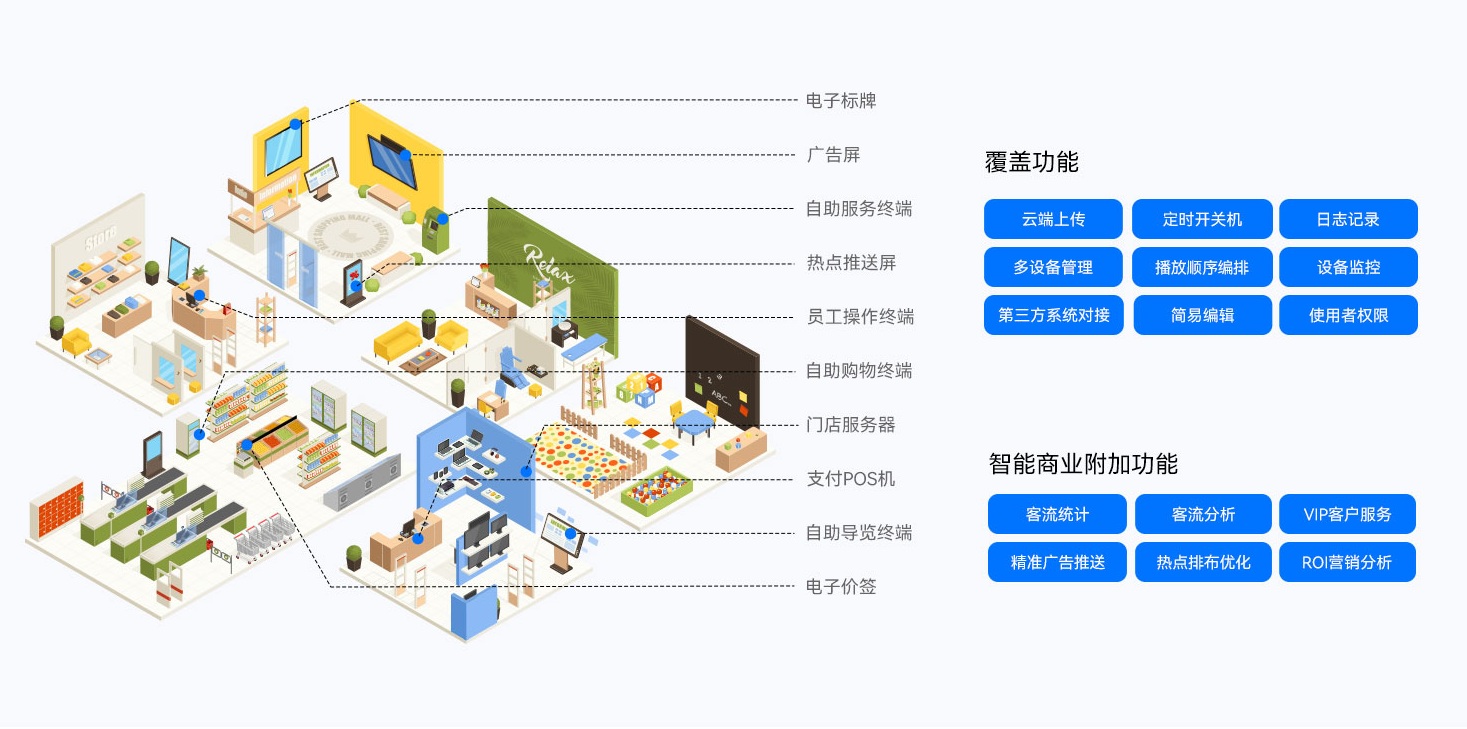 三亿(集团)体育智慧零售解决方案搭配 三亿(集团)体育GDSM-ES智能零售管理系统,为全球零售门店客户提供了功能齐全的数字化运营管理工具,提供广告显示信息编辑、信息发布、AI识别、客户分析和会员管理等功能,实现对设备、内容、营销、运营的综合数智化管理能力,为精准运营管理赋能。