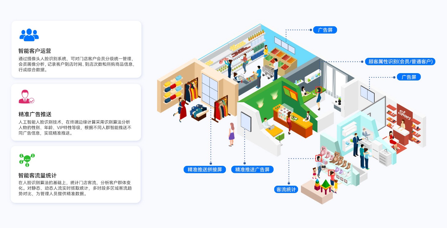 三亿(集团)体育GDSM-ES智能零售管理系统还可实现宣传推广内容的精准推送,高效触达。系统融合人工智能技术,采用专业的人脸识别算法,通过终端接入摄像设备与AIOT设备,自动识别不同的物体、动作和行为,形成人物画像,为广告屏幕的内容推送提供数据支持,实现精准营销。同时还可以提供客流统计和客群分析功能,为零售客户提供精准的门店数字化运营管理方案。