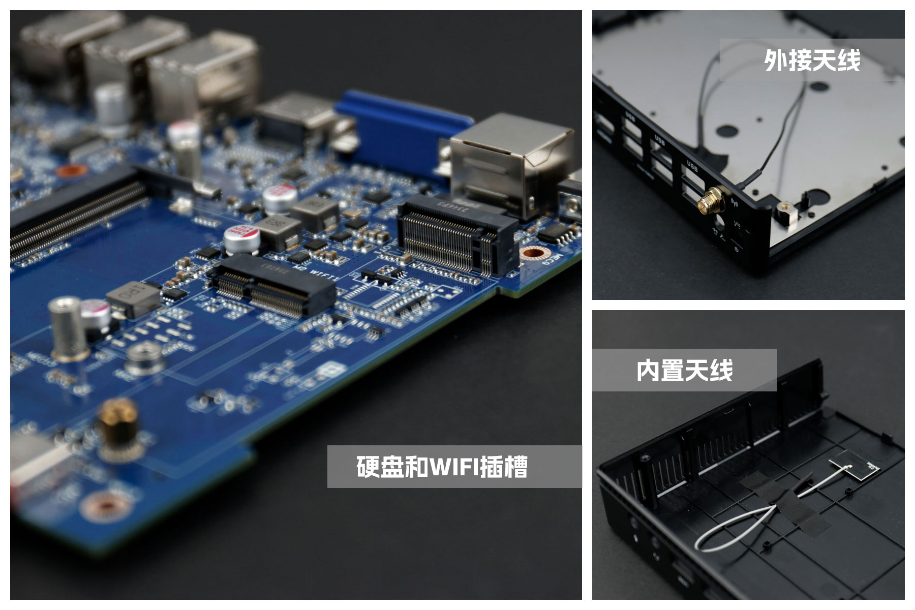 三亿(集团)体育桌面云终端Y-BOX S2主板上配备了 1个 M.2 固态硬盘位,接口规格为 PCIe3.0 标准,匹配标准的 2280 规格硬盘。一侧还有一个M.2接口,匹配2230长度的WIFI/BT模块插槽,WiFi模块可以连接的是外接天线,增强信号,同时也可以内接天线,灵活应用,支持Wi-Fi 5/6/6E网络。
