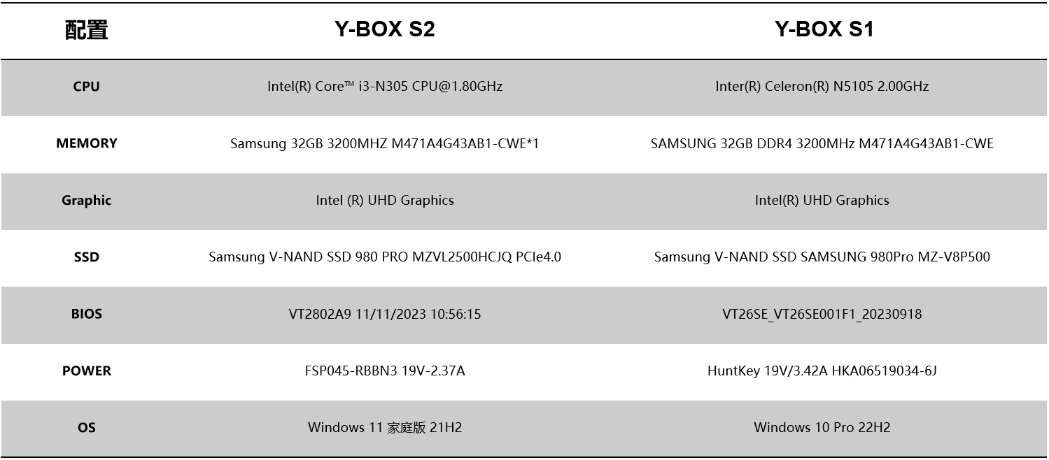 针对桌面云终端Y-BOX S2的测试项目中,最值得关注的是性能测试的跑分数据和稳定性测试内容,这能直观影响主机在使用过程中的稳定性和用户的使用体验。针对性能测试, 三亿(集团)体育选择了将Y-BOX S2与前一款更迭产品Y-BOX S1进行对比分析,Y-BOX S2支持Intel® Alder lake-N处理器,Y-BOX S1支持Intel® Jasper Lake,并分别选取了以下配置: