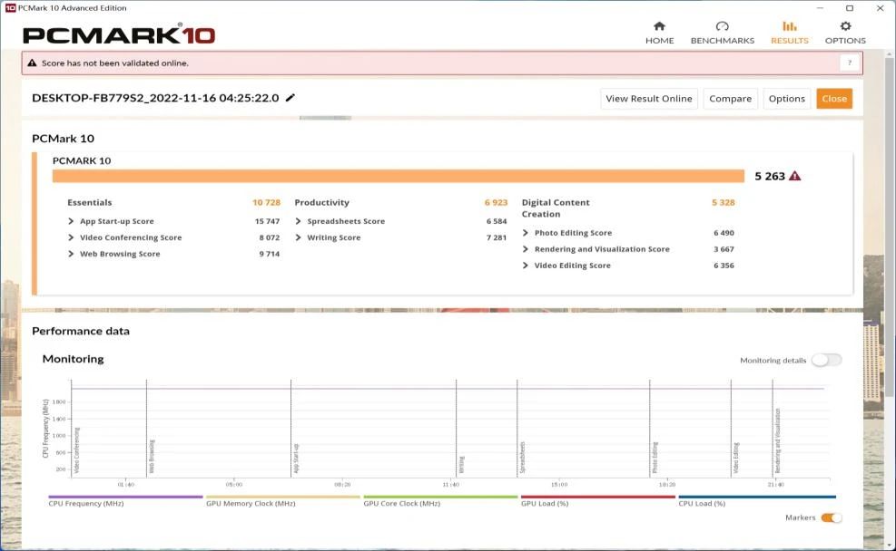 在PCMark 10测试中(网页浏览、办公应用程序、视频会议、文字处理、图片编辑、视频渲染以及游戏等常用功能),CB4-8121综合得分为10728、生产力得分为6923,数字内容创作为5328,表示CB4-8121同时运营十多个程序不卡顿。