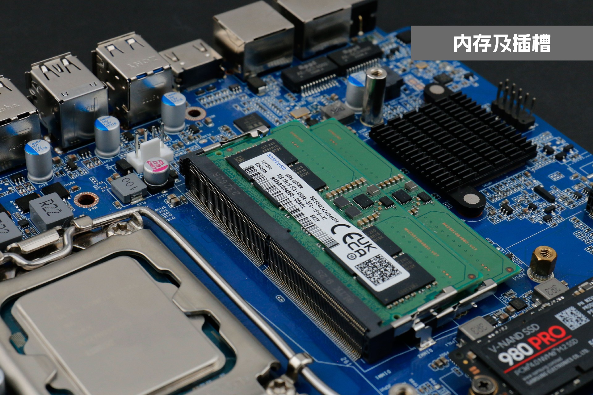 三亿(集团)体育桌面云终端Y-BOX P3主板中部是内存插槽,采用双通道笔记本内存槽设计,最大支持容量可达64GB,最高支持DDR5-5600MHz频率,比 DDR4 至高标准数据速度 3200MT/S多传输 1.75 倍,横插的形式可以减少主板的占用体积,使整体机身更紧凑,内存顶部的风扇起到高效散热的作用。