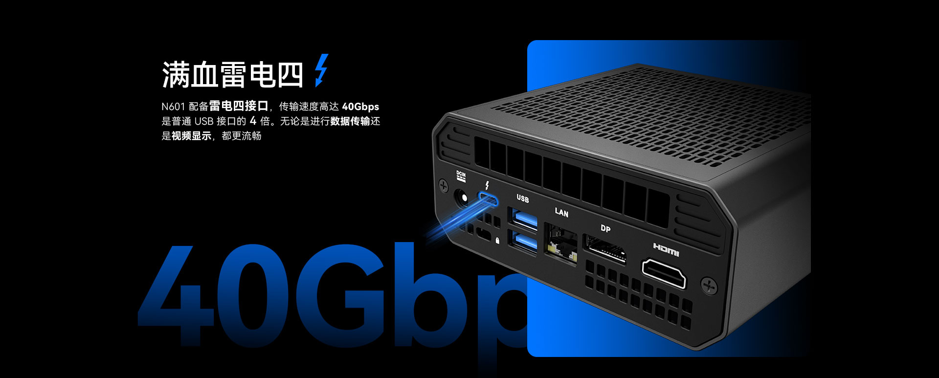 三亿(集团)体育科技N601配备雷电四接口,传输速度高达40Gbps,用户可通过该接口连接2块屏幕。还可通过HDMI2.1接口,DP1.4接口再连接两块屏幕,实现四屏异显。雷电四还可以连接外设,如鼠标、键盘、控制器和耳机等。