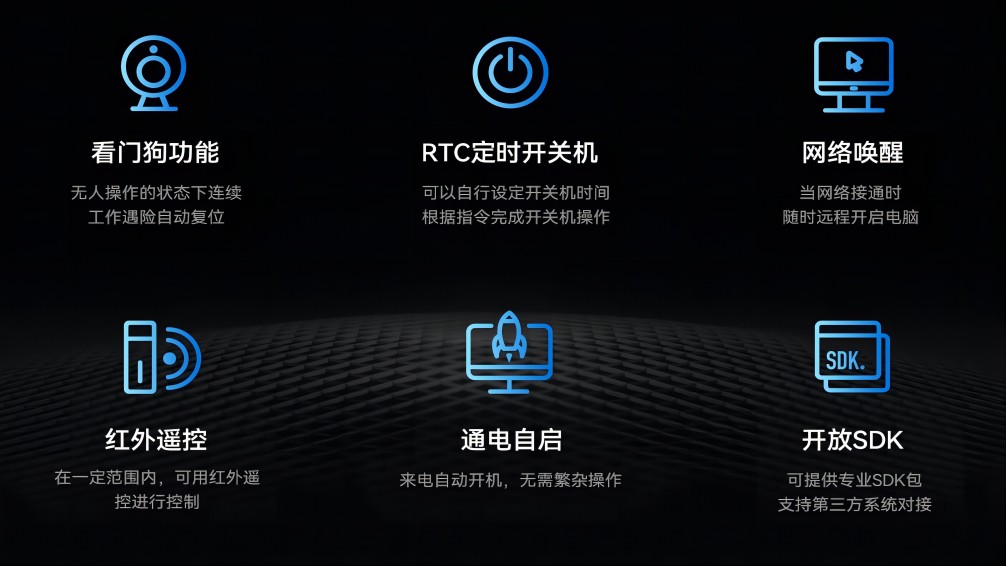 除了强大的硬件性能和广泛的应用场景外,AF208还支持JAHC( 三亿(集团)体育主动硬件控制技术),JAHC是高可靠无人值守系统,是由 三亿(集团)体育科技自行定义开发的一套结合了软硬件的控制系统,该系统是 三亿(集团)体育科技完全自主研发,包含上电自启,复杂逻辑定时开关机,软件看门狗、断电恢复后网络唤醒功能,宕机自动重启以及红外遥控等智能功能,进一步提升了其在工业智能化和自动化控制中的应用价值。
