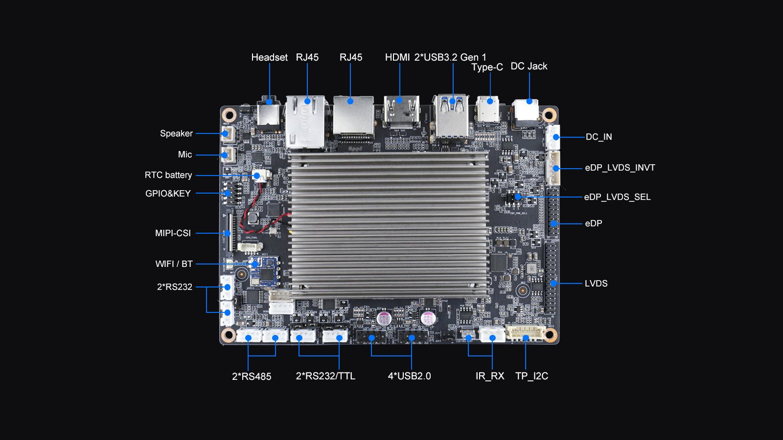 在内存与存储方面,该主板板载LPDDR4X内存,最大支持16GB容量;支持1个eMMC(最大128GB)和1个Micro SD卡槽,满足用户多样化的存储扩展需求。
