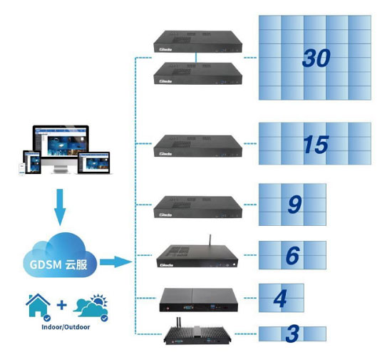 与常规分屏展示方案不同,在 三亿(集团)体育拼接控制器的视频输出能力和GDSM系统分组设置能力的组合下,店铺可以随时调整的拼接放置样式;快速设置屏幕的拼接、分组方式;快速编辑制作并发布信息;是一套安装部署迅速、内容调整迅速、更新反馈迅速的一体化信息发布方案。