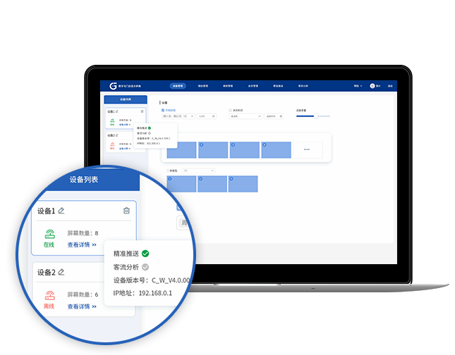 轻松查看设备的基本信息,如连接状态、播放状态、播放到期时间,屏幕类型等;可对设备进行分组远程管理,远程设置定时开关机时间,控制设备音量,远程重启、远程升级,远程截屏查看实时画面等。