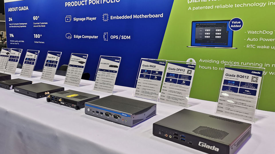 Giada的数字标牌播放器、边缘计算机和OPS产品可以满足多种应用场景,尤其是在数字标牌和交互式信息亭应用领域。企业可以利用这些先进的解决方案,创建生动丰富的数字显示屏,提供有针对性的广告,并为用户提供引人入胜的互动体验。从零售环境和交通枢纽到企业大堂和招待场所等各个行业,Giada的产品重新定义了信息交流和体验共享的方式。
