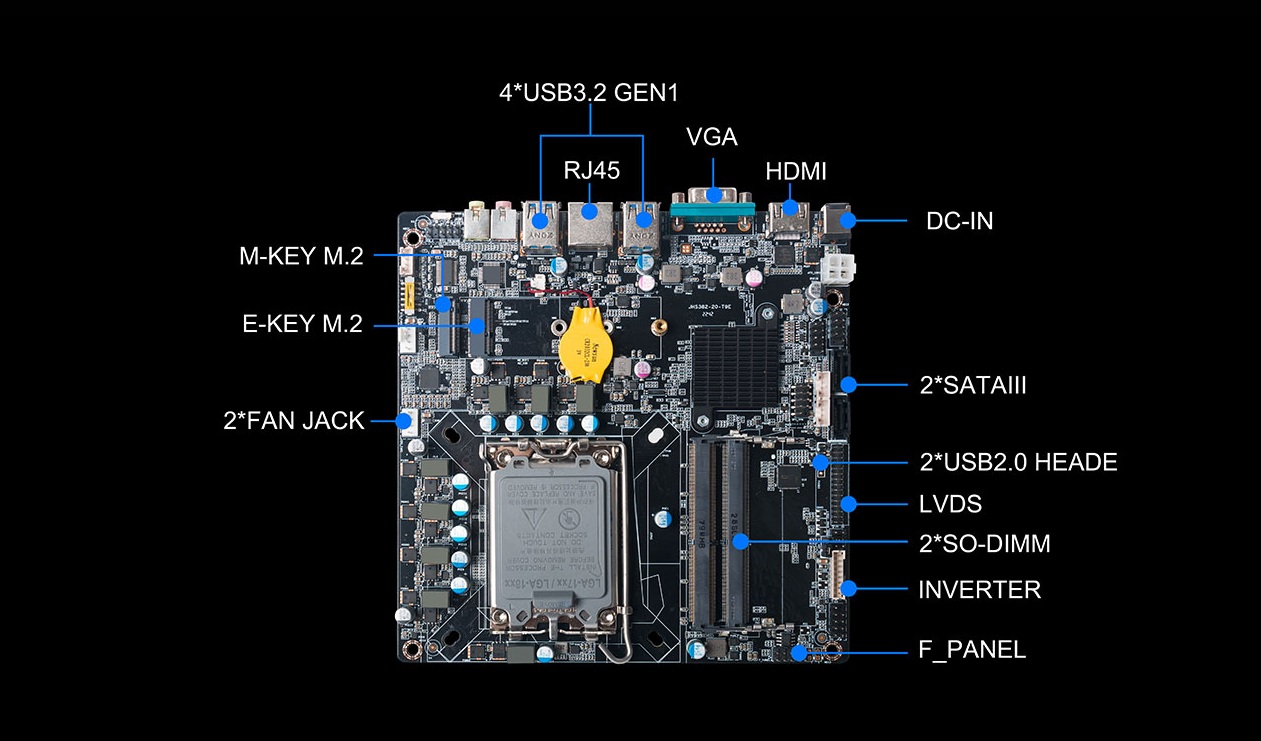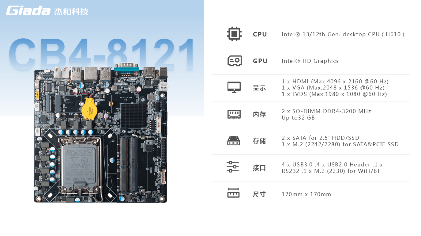 另外,一体机相对于传统的电脑更加美观,更加节能环保,而且一体机在使用体验方面也有独特的优势:比笔记本屏幕大,比台式机更简洁,也解决了一直为人诟病的台式机线缆多而杂的问题,因此,越来越多的教育办公、日常娱乐和学习的用户选择使用一体机。Giada 三亿(集团)体育科技根据市场与客户需求,推出这款高性能的一体机专研主板CB4-8121,带来全新震撼体验。 三亿(集团)体育科技主板CB4-8121是基于Thinmini ITX一体机标准设计,采用Intel Alder Lake-S平台H610芯片组,支持全新第13/12代Core i7/i5/i3处理器,搭载双通道SO-DIMM DDR4-3200MHz内存、1 x M-Key M.2 (2242/2280) SSD和 2 x SATAIII存储,强大的配置能够为用户带来出色的计算和图形处理性能,无论是载入游戏、数据传输还是平面设计,赋予用户更加极致流畅的使用体验。