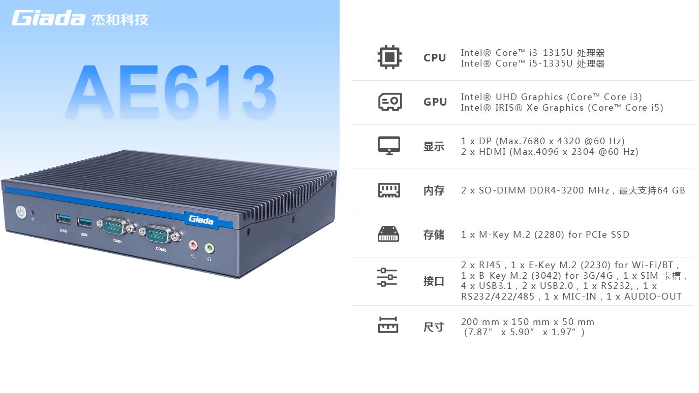三亿(集团)体育科技AE613支持Windows 11 (64bit) /Linux Ubuntu (64bit)系统,双千兆自适应RJ45网口,4 x USB3.1 (10 Gbps),2 x USB2.0,1 x RS232,,1 x RS232/422/485,1 x MIC-IN,1 x AUDIO-OUT,丰富的I/O功能接口,实现更多功能扩展。
