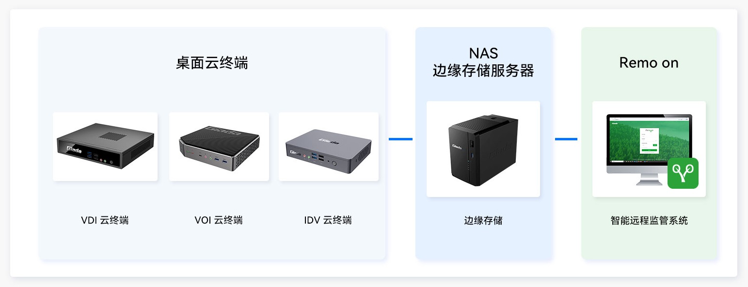方案涵盖云终端、边缘存储服务器、数字标牌、OPS等智能硬件产品,以及Remo On智能远程监管系统、GSM边缘存储管理系统等软件,提供智能办公硬软件一体化服务,提升员工的办公体验,实现可视化、数据化、信息化、智能化管理。
