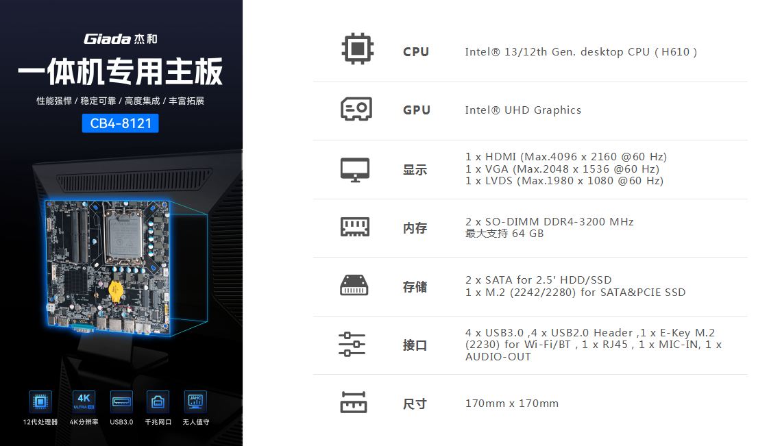 一体机在使用体验方面也有独特的优势:比笔记本屏幕大,比台式机更简洁,也解决了一直为人诟病的台式机线缆多而杂的问题,另外,随着计算机硬件和制造工艺的不断发展,一体机的性能也在不断提高,因此,越来越多的教育办公、日常娱乐和学习的用户选择使用一体机。Giada 三亿(集团)体育科技根据市场与客户需求,推出这款高性能的一体机专研主板CB4-8121,带来全新震撼体验。