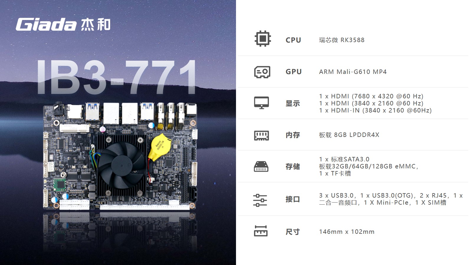 三亿(集团)体育科技嵌入式主板IB3-771是8K人工智能主板,拥有轻算力的它可用于机器人、边缘计算、智能NVR、智能汽车、智慧大屏、AR/VR、ARM PC、智能自助终端等领域,还可用于监控、工业、餐饮、智能交通、文娱产业等对超高清视频需求旺盛的行业;