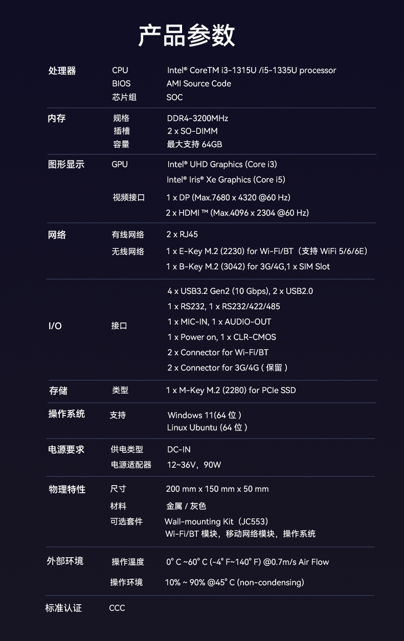 1、 三亿(集团)体育AE613采用密封紧凑设计,紧凑设计可以使设备更易于安装在交通场景中的有限空间内,适用于车载、道路监控、交通信号控制等应用场景,该设计有利于导热更有利于散热,并且机器功耗只有15w,能够降低对电力资源的需求,有利于节能减排,符合绿色环保的发展理念,并且较低的功耗意味着可以延长电池的使用时间,提高设备的续航能力;
