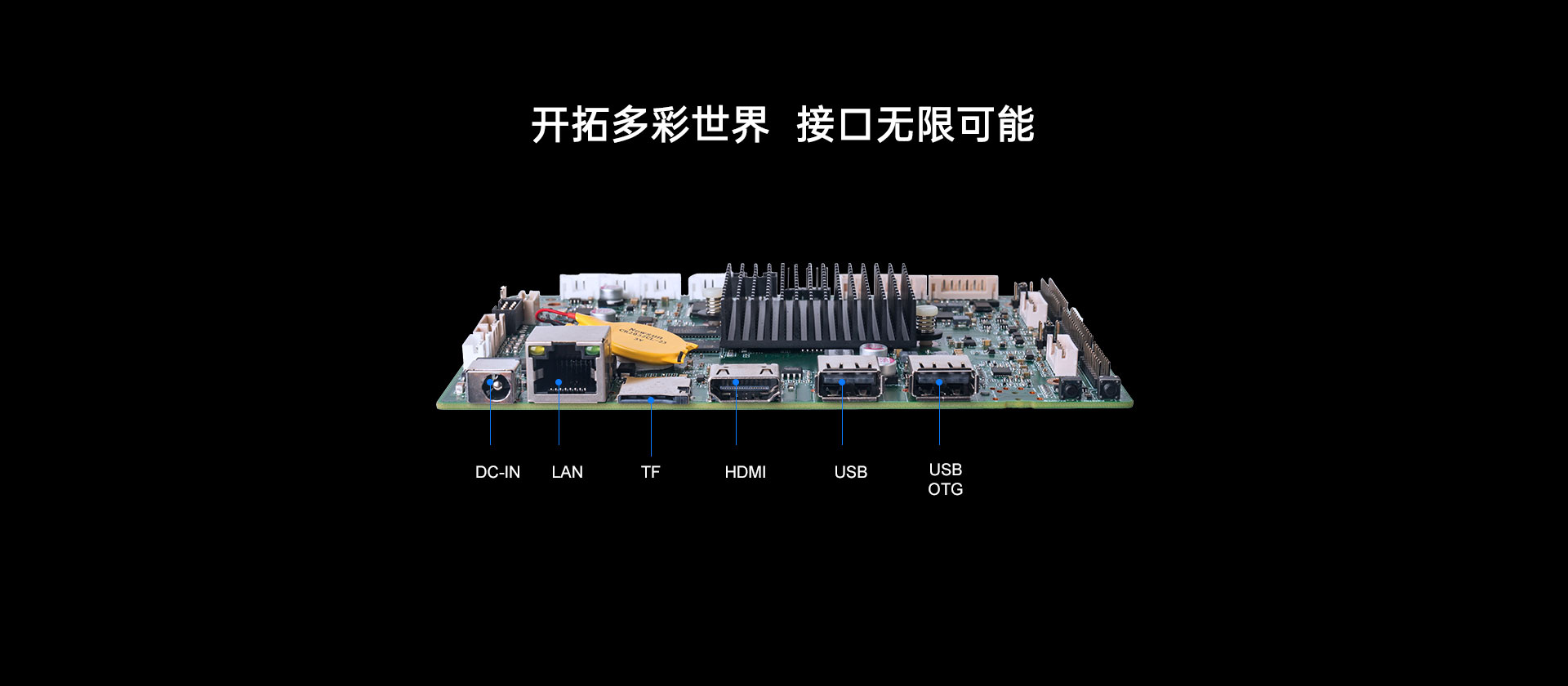 | 外部I/O | 接口 | 1 x HDMITM(Max.4096 x 2160 @60 Hz) 1 x LVDS(Max. 1920x1080@60Hz)(可选eDP/MIPI-DSI) 1 x USB2.0(OTG),1 x USB2.0 1 x RJ45 1 x TF卡槽 1 x 2-IN-1 Headset (AUDIO-OUT & MIC-IN) |